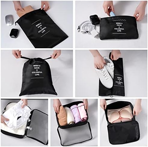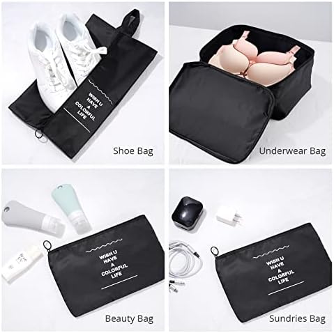 8 verpakkingsorganizer: 3 verpakkingskubussen voor op reis + 4 compressiezakken + 1 schoenentas, scheiden van schone, vuile kleding, natte handdoek, wasgereedschap, cosmetica; Je schoenen opbergen met één speciale tas; Je kleding beschermen tegen kreuken, stof en beschadigingen