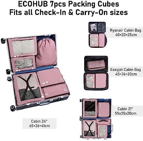 ECOHUB inpakblokjes voor koffer 7 PCS Reis organisator Verpakkingszakken Gerecycleerd Reistoebehoren Schoenen zakken voor reizen Opbergtas De Zakken van de bagageorganisator Reisetui(Roze)