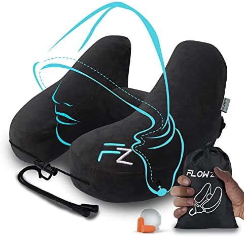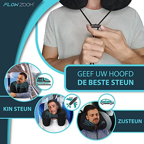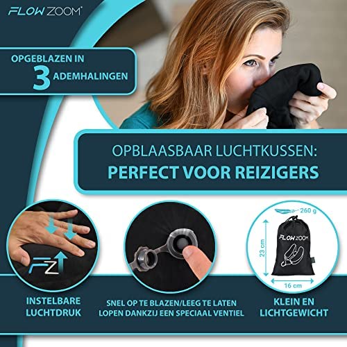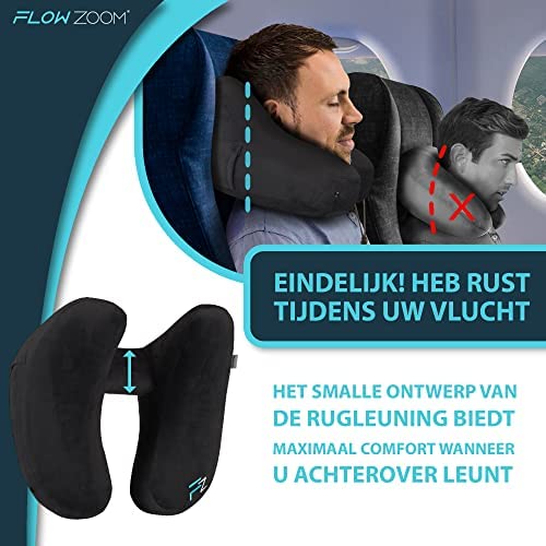 FLOWZOOM Opblaasbaar Reiskussen met Hoes | Nekkussen voor in het Vliegtuig, de Trein en Auto’s | Reiskussen met Unieke H-Vorm voor 360 Nek Ondersteuning | Snel Opblaasbaar | Zwart