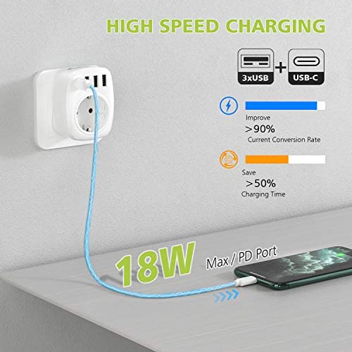2. 5-in-1 reisadapter – 1 AC-stopcontact (2-polige Europese geaarde veiligheids), 1 snellader type C-aansluiting + 3 USB-aansluitingen voor het gelijktijdig opladen van 5 apparaten met hoge snelheid. 2.4A USB is compatibel met smartphone, 3.0A type C is compatibel met Macbook, laptops en andere apparaten.