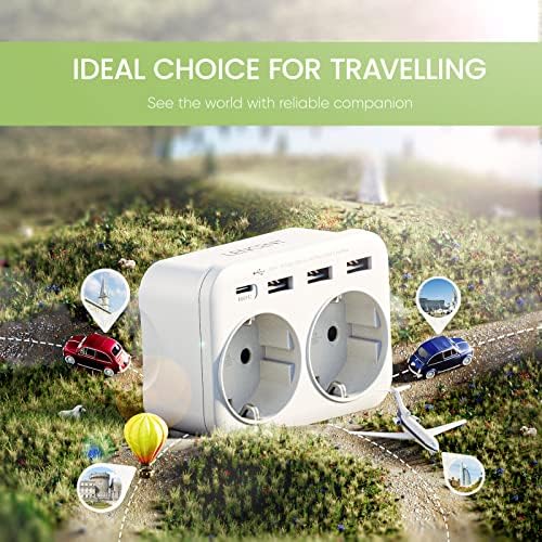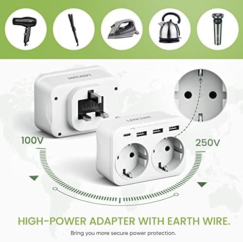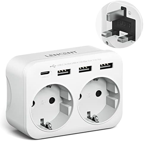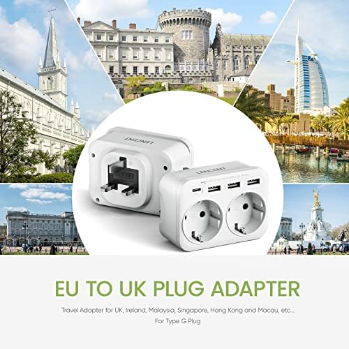 LENCENT Reisadapter UK Duitsland Type G aansluiting met 3 USB poorten en 1 USB-C poort, EU Schuko 2-pins naar 3-pins UK aansluiting voor Schotland, Ierland, Wales, Maldiven, Verenigd Koninkrijk