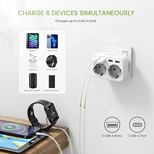 【 6 in 1 Reisadapter 】 2 AC Schuko stopcontacten + 1 Type-C poort + 3 USB poorten, Laad tot 6 apparaten op hoge snelheid tegelijk.5V 2.4A USB is compatibel voor laptops, 5V 3.0 A Type-C is compatibel voor Macbook, computers en andere apparaten.Rated power 110V~250V-3250W.