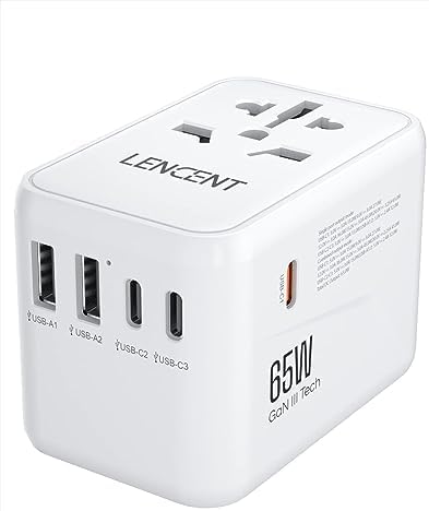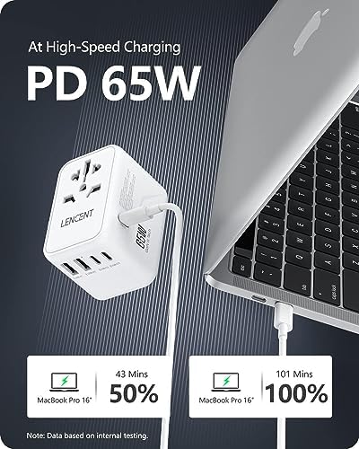 LENCENT Universele Reisadapter, GaN III 65W Internationale Lader met 2 USB-A&3 Type-C PD Snelladen, Wereldwijde Reisstekkeradapter voor Type A/C/G/I (VS/UK/EU/AUS) Stopcontacten, Wit