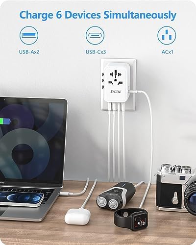【AUTO-ID technologie voor slim opladen】 De LENCENT Reisadapter met 2 USB poorten & 3 Type-C poorten is in staat om op intelligente wijze aangesloten apparaten te identificeren en de optimale laadstroom te detecteren en te leveren om snel en veilig opladen te garanderen.