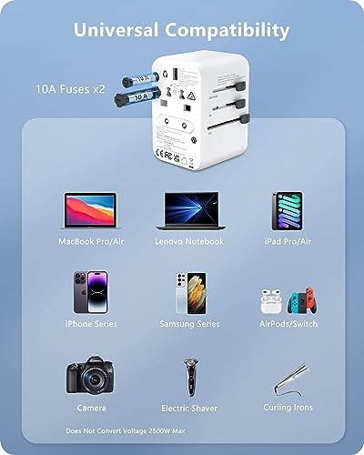 【Cutting-edge GaN III technologie】GaN Pro technologie maakt onze nieuwste reisadapter kleiner zonder dat de prestaties afnemen en zorgt voor een betere snellaadervaring bij lage temperaturen. Uitgerust met een ingebouwde dubbele zekering van 10 A voor overbelastingsbeveiliging en veiligheidsklep, beschermt hij mensen tegen verwondingen bij het rechtstreeks aanraken van spanningvoerende onderdelen in het stopcontact.