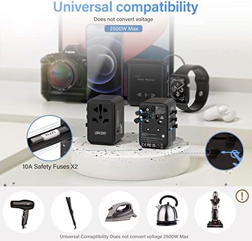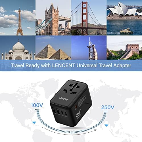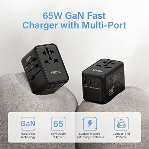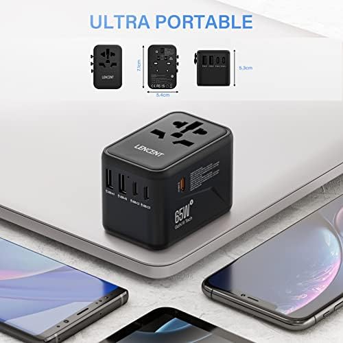 LENCENT Universele Reisadapter, GaN III 65W Internationale Lader met 2 USB-A&3 Type-C PD Snelladen, Wereldwijde Reisstekkeradapter voor Type A/C/G/I (VS/UK/EU/AUS) Stopcontacten, Zwart
