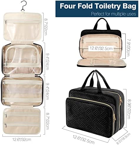 Luxspire Travel Toiletry Bag, 4 Sections Hanging Cosmetic Bag Large Travel Bathroom Shower Bag for Women, Portable Makeup Storage Case Organizer for Full-sized Toiletries Brush Set Accessories, Black
