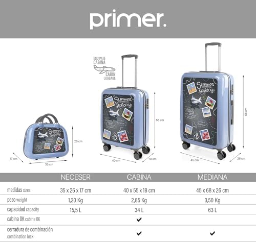 PRIMER – Koffer en Handbagage Koffer 55x35x25 – Cabin Luggage, Carry On Suitcase, Cabin Suitcase. Combinatie Hangslot 132750, Blauw
