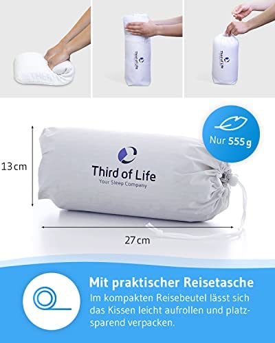 LICHT & RUIMTEBESPAREND – Nauwelijks zwaarder dan een halve liter water en met een extra zwarte katoenen overtrek. Dankzij de praktische reistas neemt u het kussen overal naartoe. Traagschuim hoofdkussen!