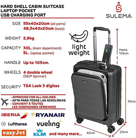 Sulema Cabine bagage Ryanair 55x40x20 cm, handbagage, lichtgewicht, harde schaal en bestendig ABS met 4 dubbele wielen 360º, TSA-slot USB en laptopzakhand, Zwart, 55x40x20