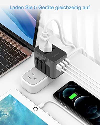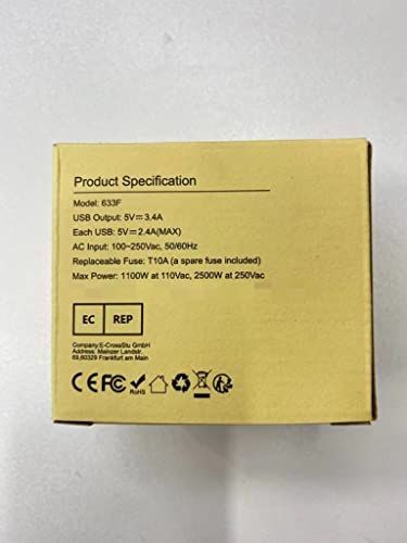 Universele reislader met snelladen: 4 USB-poorten (elke USB-uitgang 5V/2.4A MAX, totale output: 5V/3.4A MAX) en 1 AC. De universele reisstekker kan 5 apparaten tegelijk opladen, zoals smartphones, tablets, laptops, camera’s, enz. AC-stekker: ondersteunt 100-240V, 50/60Hz, maximale belasting 10A. Maximaal vermogen 2300W bij 230V. 1100W is bij 110V.