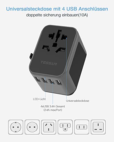 Tessan Reisadapter, 2300w Universele Stekkeradapter Met 4 Usb 2.4a, Internationale Adapter Frankrijk Naar Vs Canada Vk Italië Australië China Japan Zwitserland, Wereld Naar Frankrijk Stekker