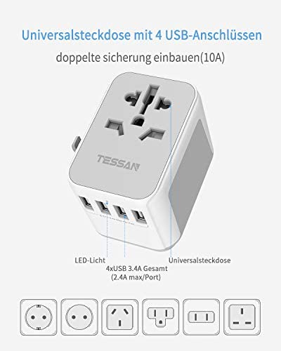 TESSAN Reisadapter Reisstekker voor 224 Landen met 4 USB & 1 AC Stopcontact Travel Adapter voor Nederland, Duitsland, USA, UK, EU, Italië, Australië, China, Thailand met Dubbele Zekering, 2300W