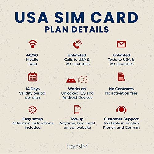 travSIM Prepaid USA SIM kaart | 40GB mobiele data met 4G/5G snelheid | Onbeperkt bellen en sms’en in de VS | Onbeperkt bellen naar 65+ landen | Werkt met iOS en Android toestellen | 14 dagen geldig