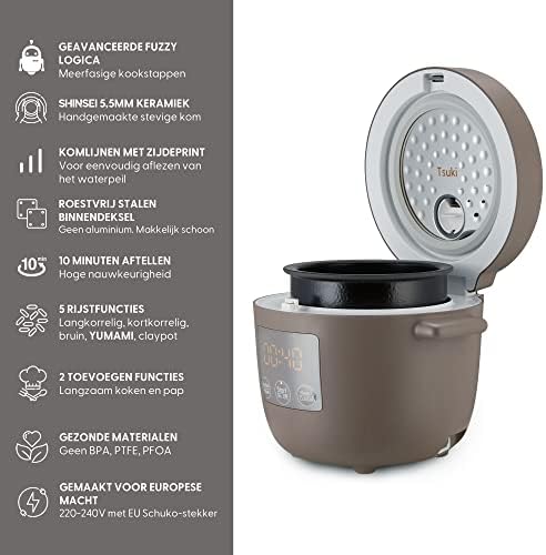 Tsuki is onze kleinste, volledig functionele rijstkoker die vol zit met alles wat je nodig hebt – ideaal voor kleine keukens, individuen of koppels die robuust en gezond willen koken met rijst en meer. Wees dolgelukkig met deze goed uitgeruste mini-rijstkoker die geweldige rijst maakt en beschikt over onze SHINSEI keramische pot voor het authentiek koken van rijst in Kamado-stijl. Onze geavanceerde fuzzy logic-technologie regelt de temperatuur voor het efficiënt en perfect koken van veel verschillende soorten rijst. Je kunt langkorrelige, korte korrel (inclusief sushi en kleefrijst), Yumami witte rijst en bruine rijst (korte of langkorrelige) koken. Tsuki kookt niet alleen perfecte rijst, maar ook andere granen zoals quinoa, couscous, gierst en Alkmaarse gort. De extra functies omvatten pap die kan worden gebruikt voor rijstepap of havermoutpap en langzaam koken (stoofschotels, stoofschotels, enz.). Tsuki is ontworpen voor gebruik in Europa (220-240V, 50Hz stroom) en wordt geleverd met een EU Schuko-netsnoer.