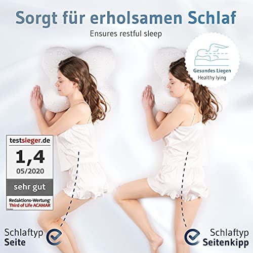 ➥ Voor zijslapers en zijslaaplussen: het ergonomische kussen is perfect geschikt voor iedereen die graag aan de zijkant of half gekanteld op de buik slaapt (afbeelding 2). Het schuim past zich optimaal aan de natuurlijke slaaphouding aan en de zijdelingse uitsparingen van de vlindervorm vormen een vrij ademgebied, dat ook ideaal is voor het dragen van CPAP-slaapmaskers.